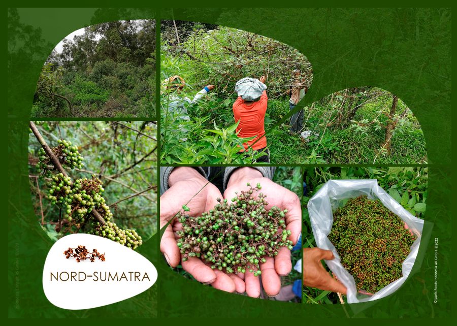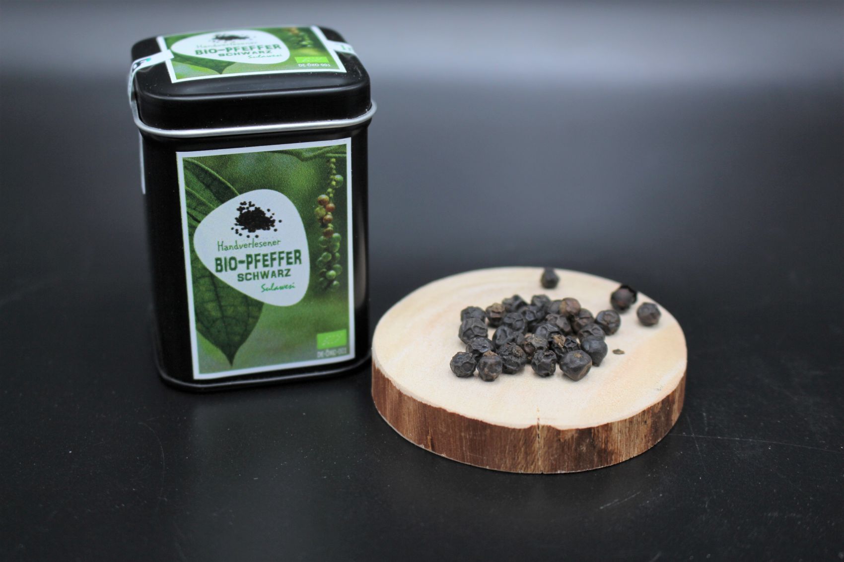 Dieser biologisch angebauter schwarzer Pfeffer wächst in Kleinst-Plantagen auf einer Höhe von etwa 300 m in Süd-Ost Sulawesi. Als schwarzen Pfeffer gibt es ihn eigentlich nur, aufgrund einer besonderen Vereinbarung unseres Partners und den Farmern, da in der Region traditionell nur weißer Pfeffer produziert wird. Er wird entsprechend exklusiv für uns bei jeder Ernte produziert und ist deshalb Jahrgangs-limitiert. Die Ernte erfolgt an den grünen bis leicht gelblichen Früchten, die anschließend in der Sonne getrocknet werden. Hierbei entsteht dann auch die schwarze Farbe durch Fermentation des Fruchtfleischs.