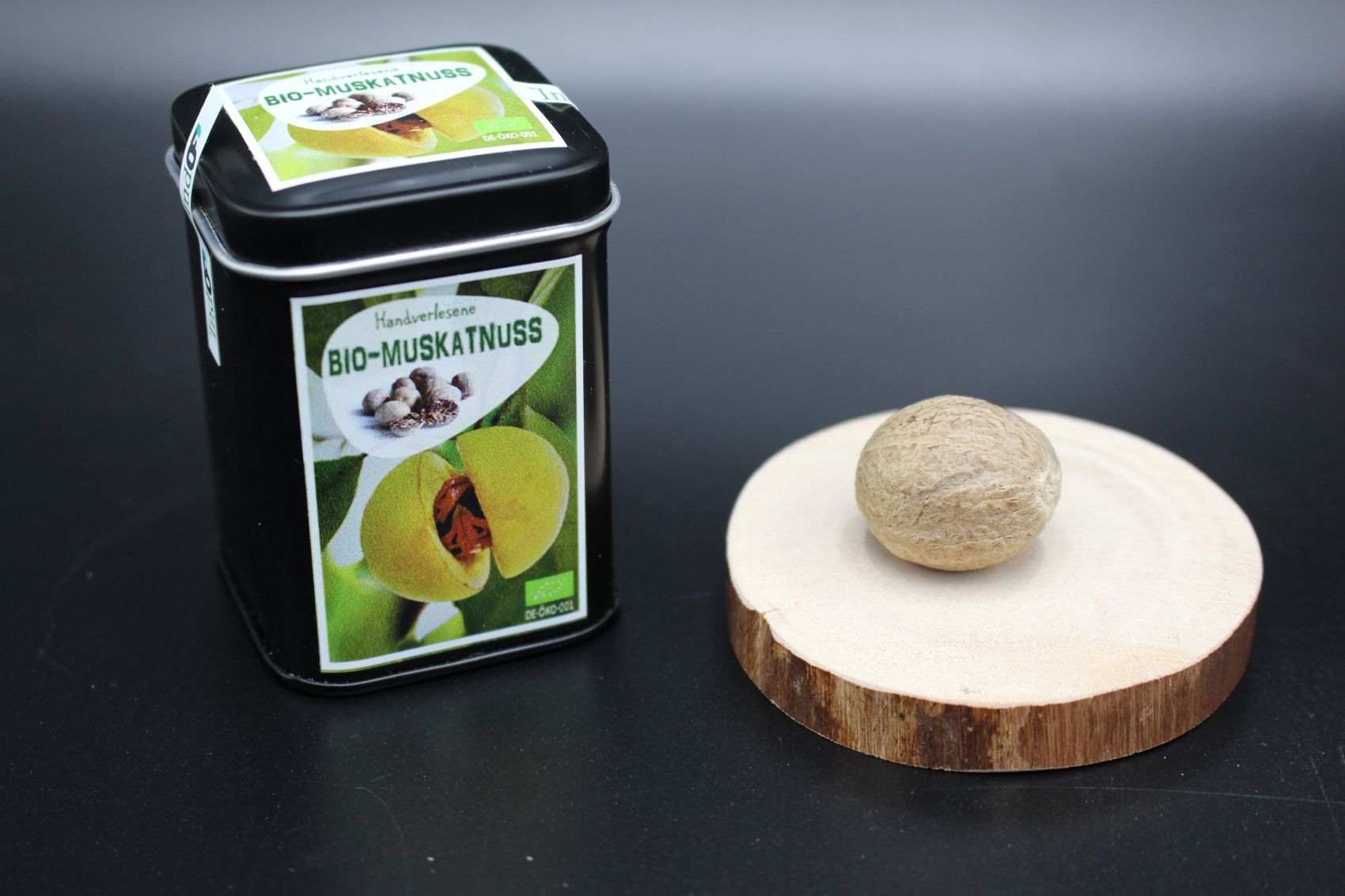 Die Muskatnuss ist im botanischen Sinn keine Nuss und besteht aus vier Einzelkomponenten. Die Muskatnuss (der Samen) im Innern ist umgeben von einer Schale und dem Samenmantel, der Muskatblüte. Diese drei wiederum sind umhüllt von einer Balgfrucht, welche bei Reife aufspringt.