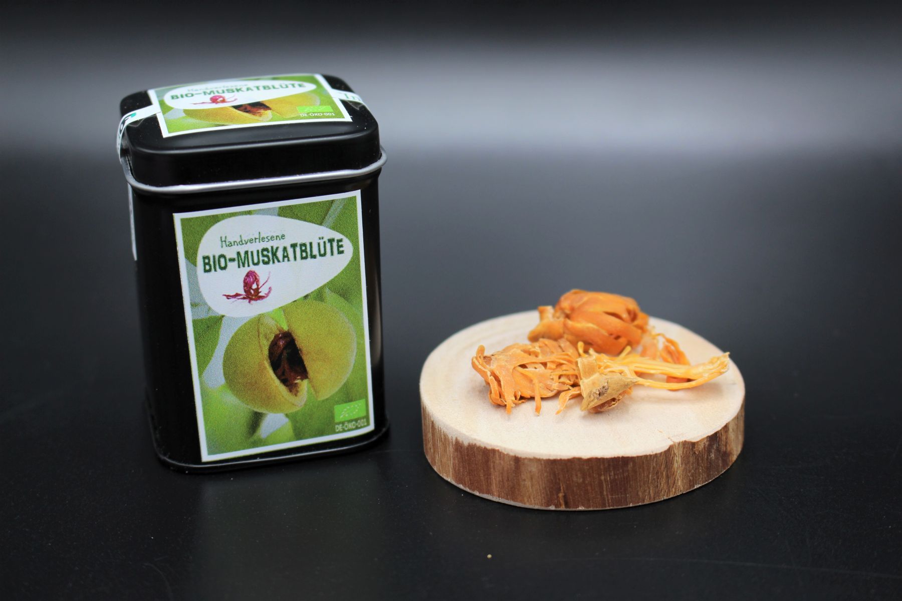 Die anfangs noch rötliche, mit zunehmender Trocknung orange-gelbliche Muskatblüte erinnert in ihrem Duft an Muskatnuss, welcher aber weniger intensiv und anhaltend ist. Trotz geringerer Intensität hat sie einen pfeffrigen, leichten Geschmack von Nelken.
