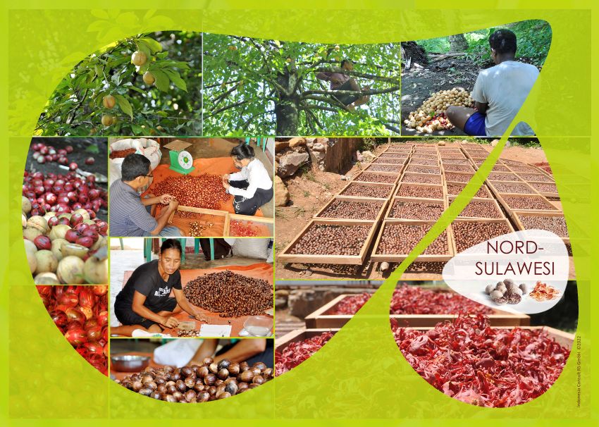 Die besten Muskatnüsse und Muskatblüten wachsen meist in kleinbäuerlichen Mischkulturen, in Sulawesi und den Molukken. Sie sind aber auch über ganz Indonesien verteilt zu finden. Oft im natürlichen Verbund mit Bäumen der Gewürznelke, Kokospalmen und Früchten wird ganzjährig geerntet. Die ersten Schritte der Verarbeitung erfolgen meist manuell vor Ort.