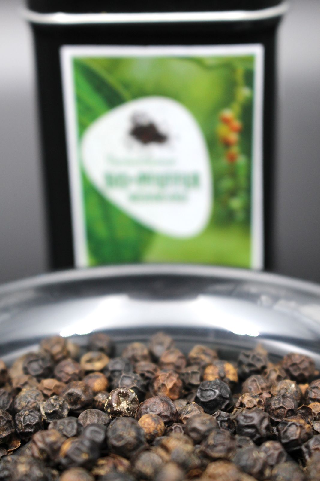 Dieser biologisch angebauter schwarzer Pfeffer wächst in Kleinst-Plantagen auf einer Höhe von etwa 300 m in Süd-Ost Sulawesi. Als schwarzen Pfeffer gibt es ihn eigentlich nur, aufgrund einer besonderen Vereinbarung unseres Partners und den Farmern, da in der Region traditionell nur weißer Pfeffer produziert wird. Er wird entsprechend exklusiv für uns bei jeder Ernte produziert und ist deshalb Jahrgangs-limitiert. Die Ernte erfolgt an den grünen bis leicht gelblichen Früchten, die anschließend in der Sonne getrocknet werden. Hierbei entsteht dann auch die schwarze Farbe durch Fermentation des Fruchtfleischs.
