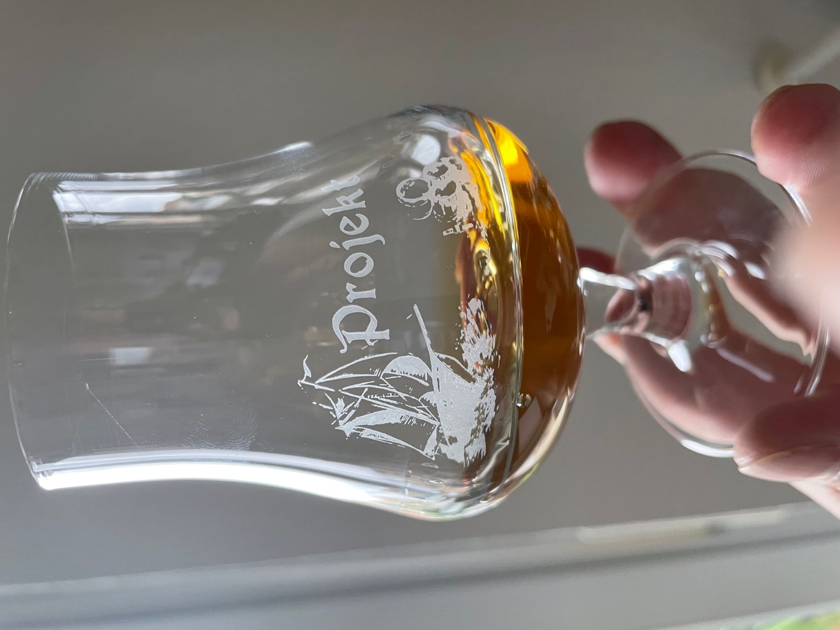 Ein Nosing-Whiskyglas mit Druck vom Logo von unserem „Projekt“